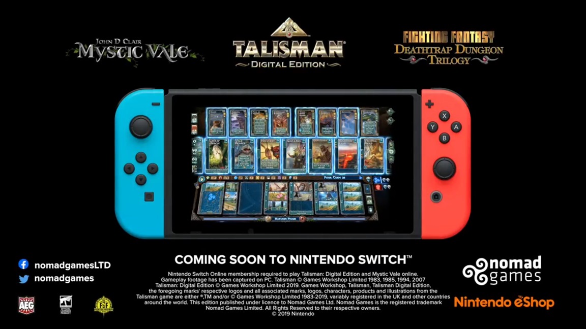 We're excited to announce we're bringing our much-loved #boardgame adaptations to the Switch with #FightingFantasy releasing 29th November and #TalismanDigitalEdition and #MysticVale landing in 2020! pic.twitter.com/QD0VXpXvyB— Nomad Games (@Nomadgames) November 15, 2019