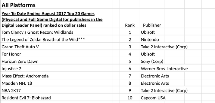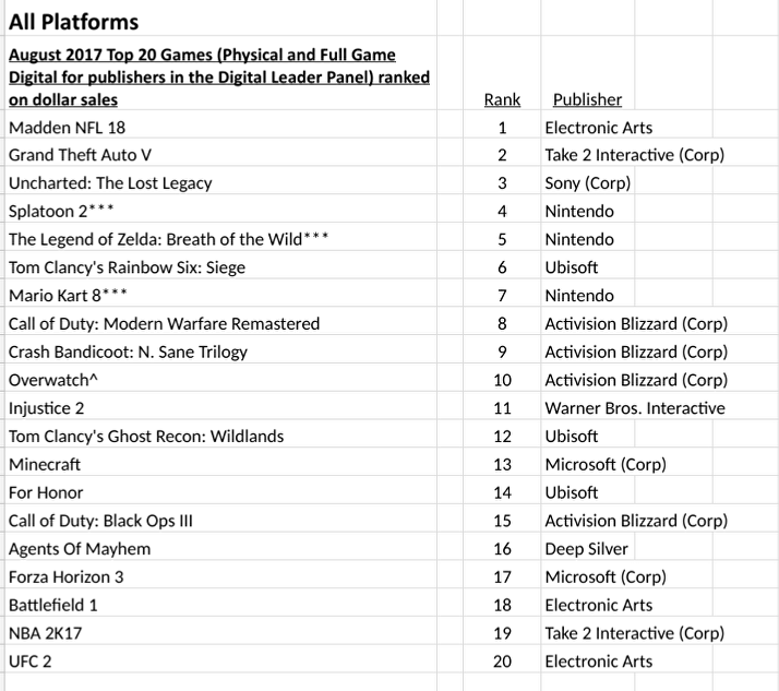 August 2017 NPD: top 20 best-selling games in the U.S., 2017 to date