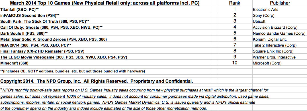 NPD Group has released a listing of the top ten best-selling games in the U.S. for the month of March 2014. The results can be found above.