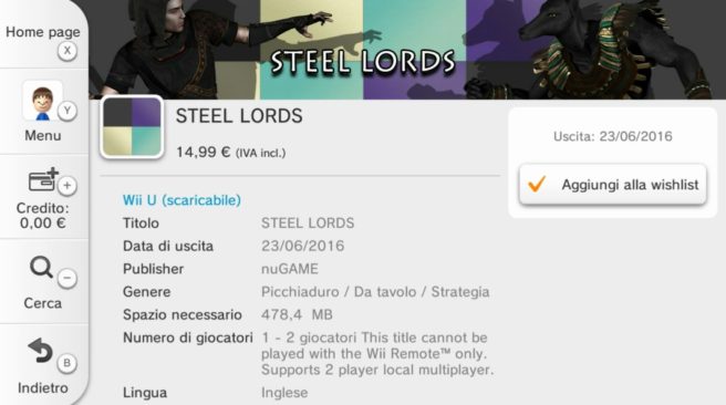 Steel Lords is hitting the European Wii U eShop on June 23, according to a listing on the digital store. It’ll cost €14.99.
