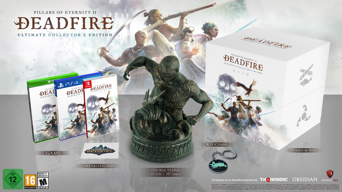 The Pillars of Eternity II: Deadfire Ultimate Collector’s Edition contains the game, metal sticker, statue, key chain, and premium box. Pricing is set at $129.99 / €129.99 / £119.99.