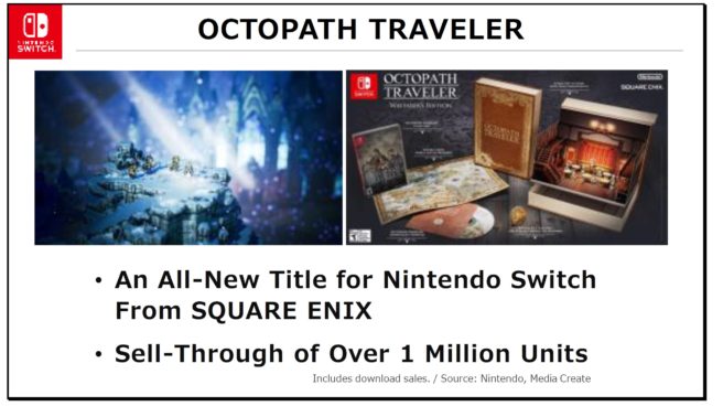 The next title I want to talk about is OCTOPATH TRAVELER, released in July of this year by SQUARE ENIX. This is an RPG featuring a special kind of graphics known as “HD-2D,” which is a fusion of 2D sprites and 3D graphics. This completely original title for Nintendo Switch earned high marks from game media reviewers and also has been well received by actual playing consumers. Despite this being a completely original title, SQUARE ENIX announced that global shipments and download sales reached 1 million units within three weeks of release. According to them, both shipments