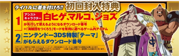 Amazon Japan and Rakuten have revealed that One Piece: Great Pirate Colosseum will release for 3DS on September 21st in Japan. The 2D action title is being developed by Arc System Works (published by Bandai Namco) and will feature 23 playable characters and over 80 additional assist characters, while also boasting strong visuals and simple, but exciting, controls. It will feature a mode where the player sails around the world, gathering their favorite crew, as well as a competitive online mode. Furthermore, first-print buyers will earn several rewards, including early unlocks for assist characters Edward Newgate, Marco, and Jozu, an in-game item for use in the “Create a Pirate Crew” mode, and a unique 3DS theme (via download code). There is also an unannounced item as a pre-order bonus from Amazon Japan.