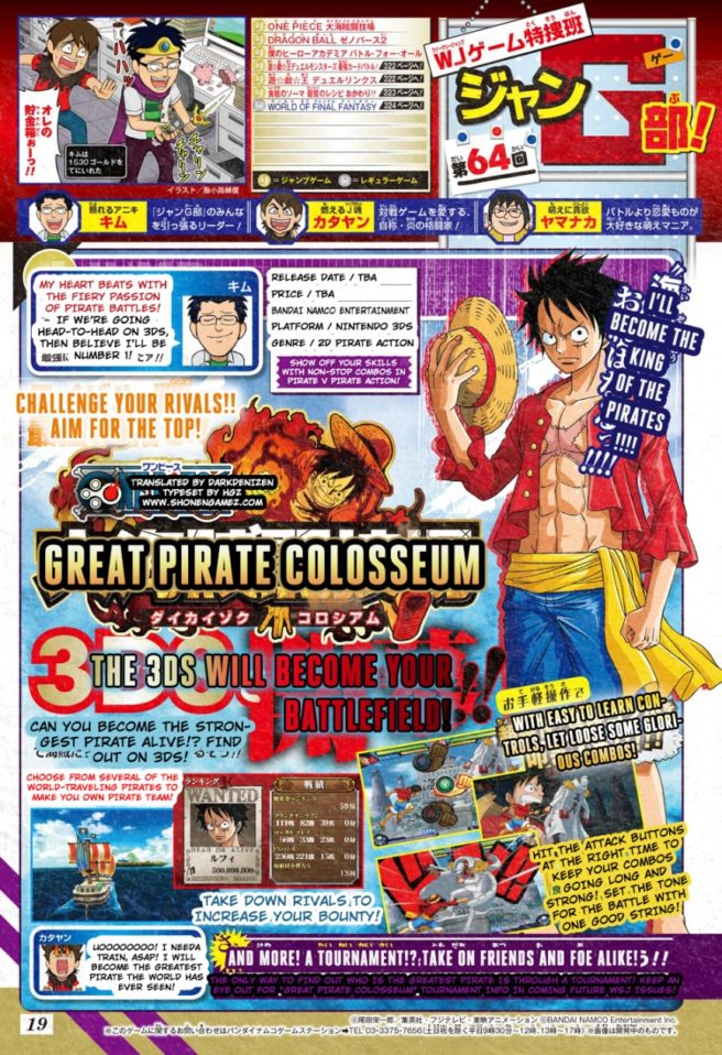 A scan from this month’s issue of V Jump, which first appeared last week, outed the existence of One Piece: Great Pirate Colosseum for 3DS. ShonenGamez has now put up the scan in full with a complete translation. You can get a look at it above.