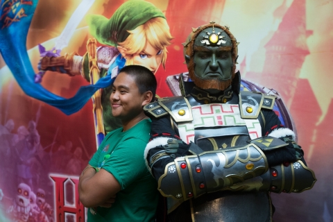 In this photo provided by Nintendo of America, from left, Uyq Nguyen poses with Andrew Hosking, dressed as Ganondorf, at an off-site event during PAX Prime 2014 on Saturday Aug. 30, 2014 in Seattle. Attendees dressed in themed cosplay or exclusive branded T-shirts had the opportunity to enter to win a piece of original concept art from the upcoming Wii U game Hyrule Warriors.
