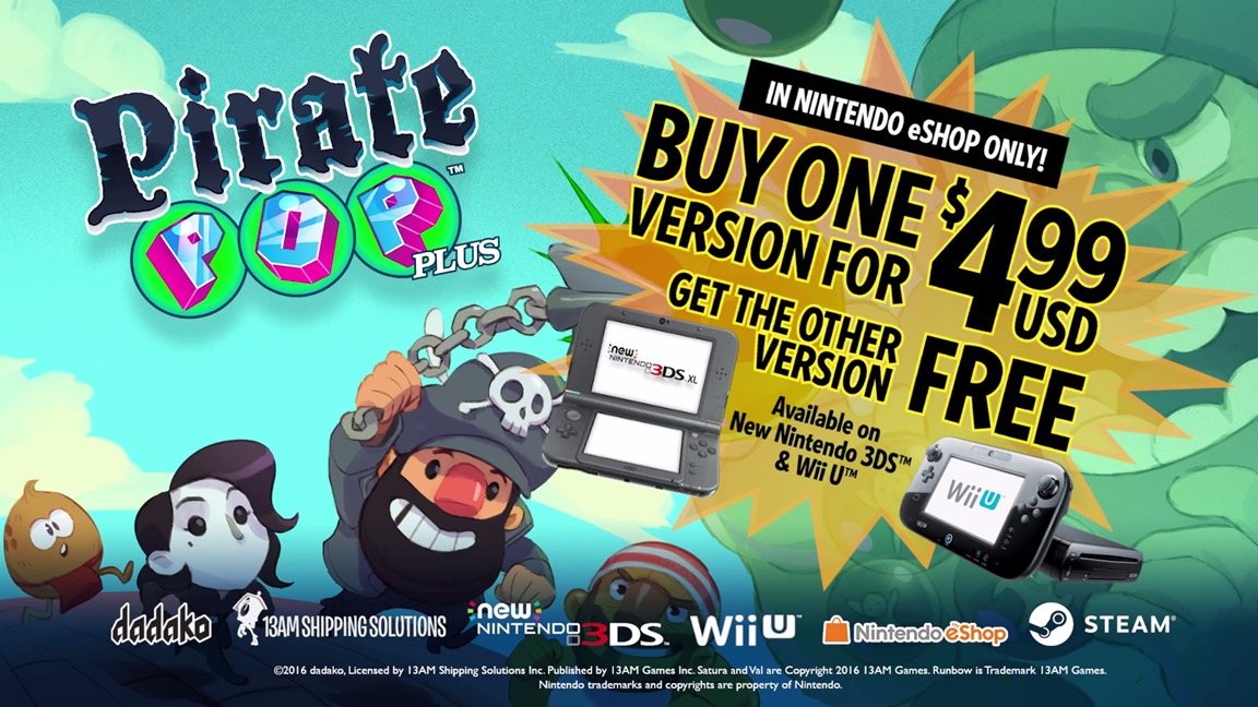 Pirate Pop Plus will launch for Wii U and New 3DS on October 20, 13AM Games announced today. The game will cost $4.99, and cross-buy will be supported. If you purchase one version, you’ll get the other at no extra cost.