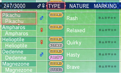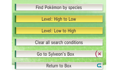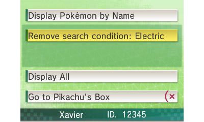 – Select a Pokémon species or another search condition on the upper screen. Press right or left on the +Control Pad to select features like type or Nature, and press up or down on the +Control Pad or use the L Button and R Button to scroll through your Pokémon