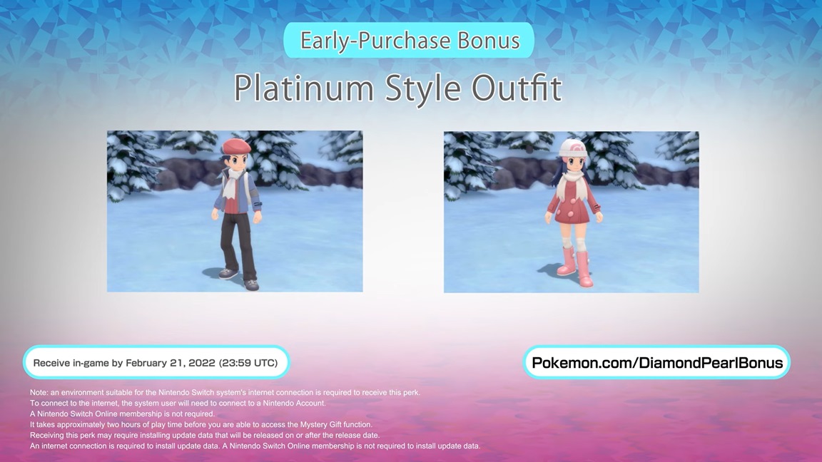 The bonus will be available up through February 21, 2022. Simply select “Get via Internet” from the Mystery Gift and it will be yours. It’s possible to change outfits at Metronome Style Shop in Veilstone City. About two hours of play time is needed to unlock the Mystery Gift feature. While an internet connection is necessary, you won’t need a Nintendo Switch Online paid membership.