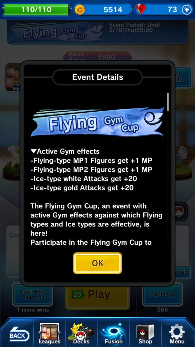 Following a required update and a brief maintenance period, the first major event for Pokemon Duel is now live. The Flying Gym Cup will last until February 16th, 4:59 UTC. During this event, getting win streaks will get you special Gym Boosters, which in turn can contain rare figures like Magikarp and Gyarados. Special trophies will also be given out at the end of this event. During the event, Flying-type Movement 1 and 2 figures will get an additional 1 Movement and Ice-type white and gold attacks get a boost of +20.