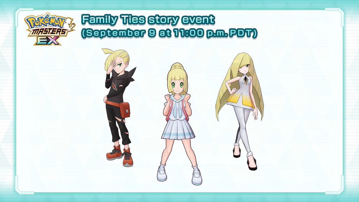New story content details have been revealed for Pokemon Masters EX. The new story content, titled Family Ties, was announced a few weeks ago and starts on September 9. New details have been revealed, and it will feature Sync Pairs of Lillie, Gladeon, and Lusamine. Not a lot of information has been given yet, but we’ll likely see more details as the event itself rolls around.