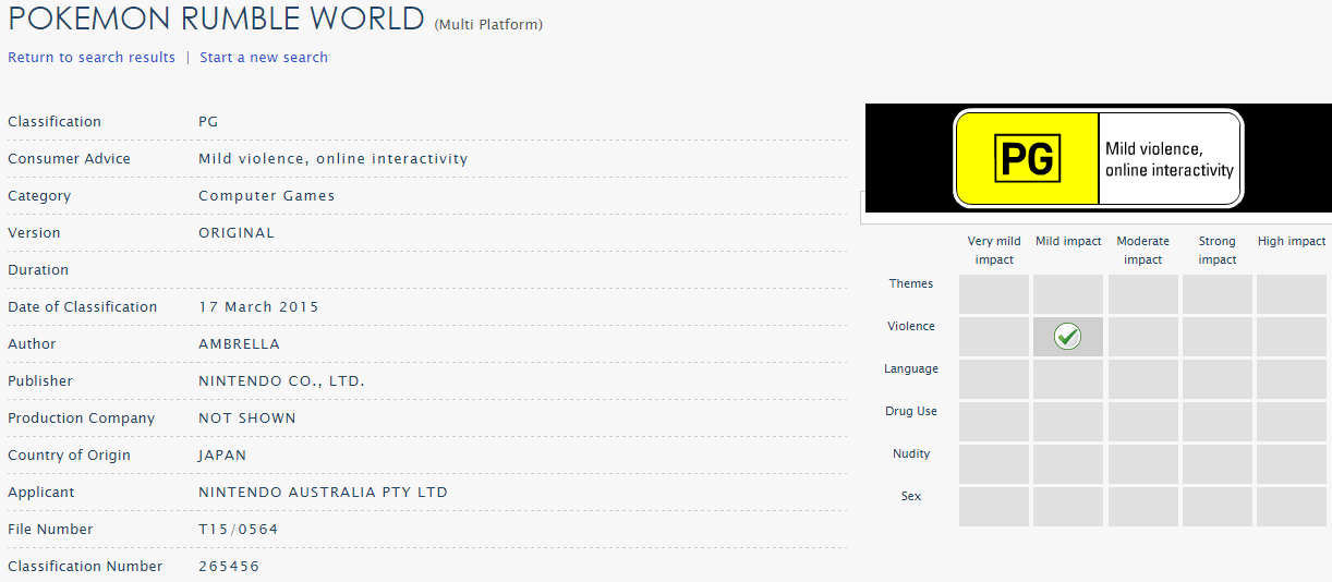An interesting title entered the Australian classification database today. Something known as “Pokemon Rumble World” has been rated, which I don’t believe is a game that already exists.