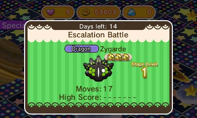 First, there is an escalation battle against Zygarde in its 50% form. Facing Zygarde will have you leveling up, with each level granting a new reward (Exp Booster S at Level 30, Exp Booster M at 40, Mega Speedup at 50, Exp Booster L at 70, Level Up at 90, and Raise Max Level at 100).