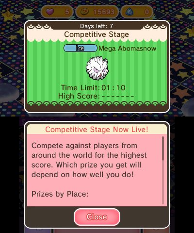 The Mega Abomasnow prizes vary by region. A Mega Speedup will be given to the top 5,000 players in Japan, 3,700 in North America, and 2,500 in Europe. The Abomasnowite will be given to the top 50,000 in Japan, 19,000 in North America, and 12,000 in Europe. Two Attack Powers will be given to the top 70,000 in Japan, 26,000 in North America, and 17,000 in Europe. All other participants will get an Attack Power.