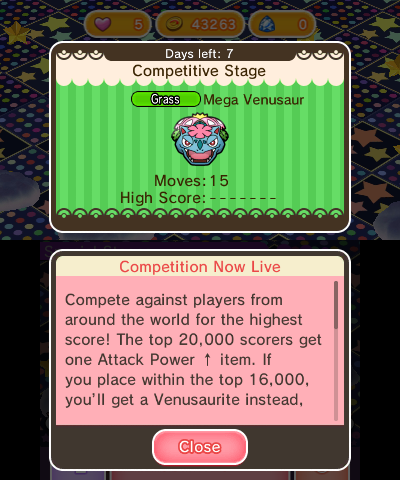 Did you miss your chance to obtain the Venusaurite in Pokemon Shuffle the first time around? Now you’ve got another chance since the competition has returned. In Europe, the top 20,000 players in the competition will receive an Attack Power Up item, the top 16,000 will receive Venusaurite and the top 1,200 will receive a Mega Speedup on top of that. Ranking below 20,000 nets you a Disruption delay. As per usual, if you already have a Venusaurite, you will receive a Jewel instead if you rank in the top 16,000.