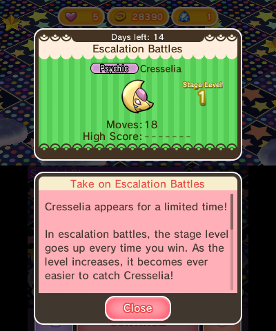 A brand new Cresselia stage is now up and gives you the chance to catch the 4th gen legendary! This special event is an escalation battle, where every time you complete the event it will get progressively harder. However, the harder it gets, the better the rewards and the easier it becomes to catch Cresselia. Once you reach level 5, you will be awarded Moves +5, at level 10 you will receive a Disruption Delay, a Mega Start at level 30, and a Mega Speedup at level 50, should you choose to play it that many times.