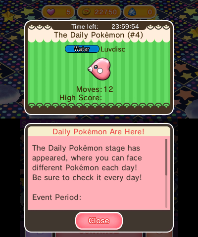 Thursday’s Daily stage on Pokémon Shuffle is here and gives you the chance to catch a Luvdisc! Luvdisc is unavailable outside of this event, so try your best to catch it every Thursday for the next two weeks! This event can only be played once per day, so make each shot count!