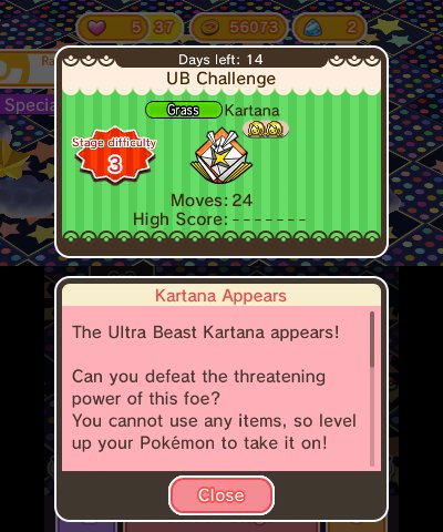 This week in Pokemon Shuffle Kartana is available for battle for 20,000 coins. Golisopod and Azumarill (winking) have begun their runs as well, all of these stages will be lasting until February 6th. Tapu Koko, Tapu Fini & Mimikiyu stages have also begun their repeat runs.