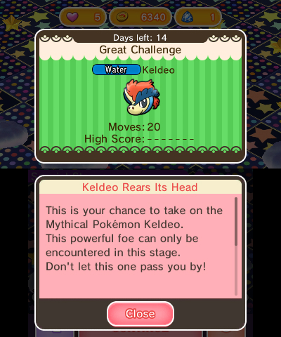 Unova’s Mythical Water and Fighting type Pokémon is now available to be caught in Pokémon Shuffle! Once you check in to Pokémon Shuffle, Keldeo will be made available right away after a quick update. Whether you’re able to catch Keldeo or not, the first time you clear the stage you’ll be rewarded with 5,000 coins. This is a pretty huge reward considering the average battle gives you around 300 coins.