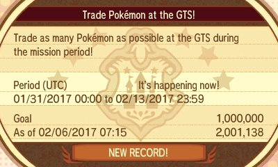 The third global mission for Pokemon Sun and Moon is now live, and it tasks players with trading over one million Pokemon via the GTS. The mission will last until February 14. To participate, you must speak to the receptionist in Festival Plaza; she is located on the right side of the central castle. If the mission is successful, then players will recieve 2,000 FC. If the mission is a failure, players will only receive 200 FC. Players who have their accounts tied to Global Link will earn double the FC. Additionally, if a player makes 5 trades during the mission period, they will be given a Rare Candy, and all players will receive a Friend Ball if 2,000,000 Pokemon are traded.