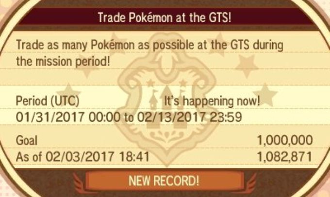 It took a few tries, but a Pokemon Global Mission has finally been successful. Pokemon Sun/Moon players were tasked with making one million trades at the GTS, and it looks like that goal has been reached. Players will receive 2,000 Festival Coins as a result.