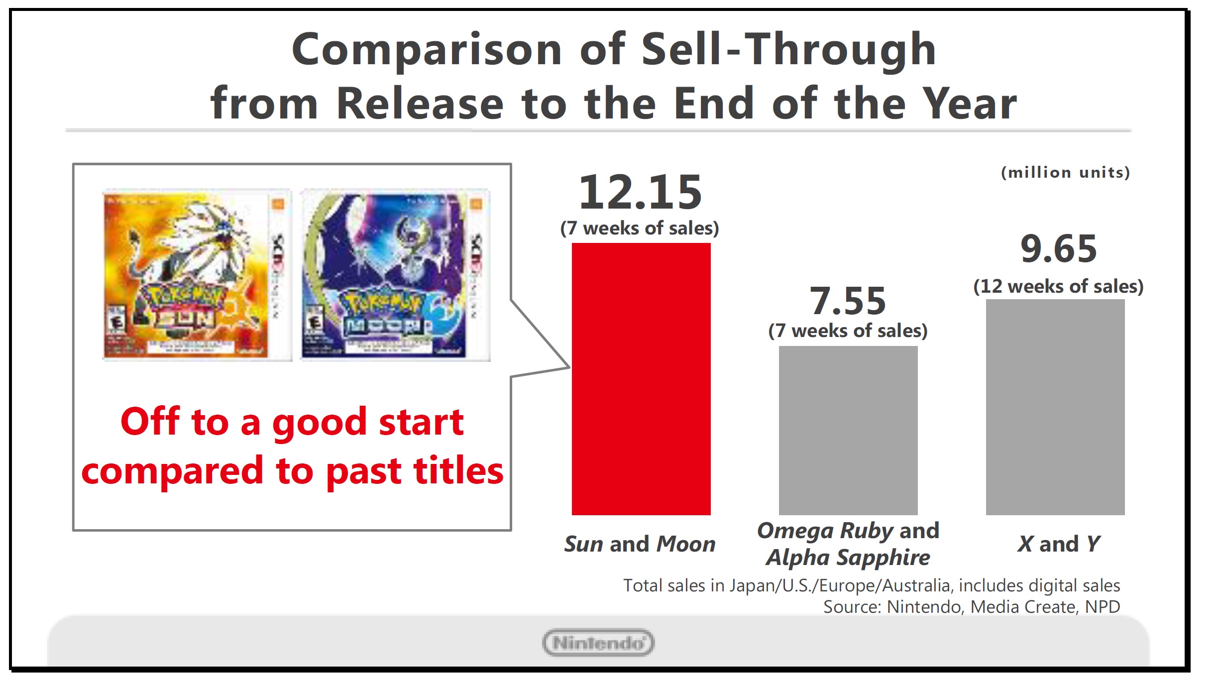 This slide compares the sell-through from release to the end of that year for past titles in the Pokémon series. You can clearly see that Pokémon Sun and Pokémon Moon are off to an excellent start, even compared to past titles. Pokémon games tend to be long-selling titles in the U.S. and European markets. We can see that these titles still have excellent sales potential. We hope to maintain this momentum going forward to ensure that Pokémon Sun and Pokémon Moon also achieve long-selling status.