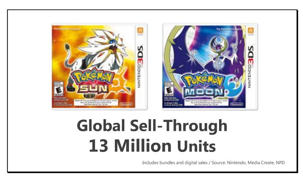 We released two completely new entries in the Pokémon series, Pokémon Sun and Pokémon Moon, worldwide in November last year, and achieved explosive sales. According to our recent analysis, the global sell-through (volume sold from retailers to consumers) has exceeded 13 million units and continues to grow.