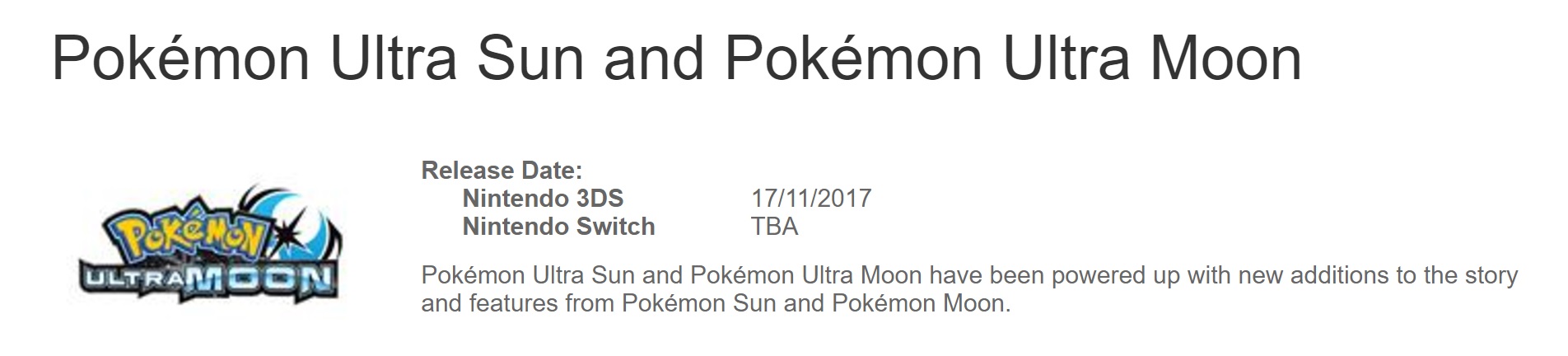 Just as expected, The Pokemon Company says that the Switch listing was an error. An official statement also reiterates that Pokemon Ultra Sun / Ultra Moon are exclusive to 3DS.
