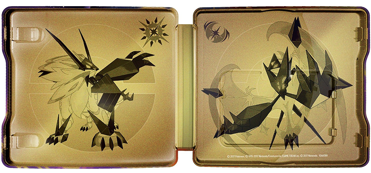 The package naturally comes with both games included. Additionally, you’ll receive a collectible Steelbook case. The outer art features Solgaleo and Lunala while the inner art has the line art of the two Legendary Pokemon on a gold background.