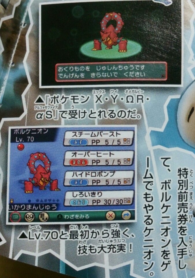 A new Pokemon distribution for Volcanion is set to begin in Japan next month, the latest issue of CoroCoro reveals. Players can obtain the new Pokemon as the pre-booking ticket distribution for the new movie, Volcanion and The Ingenious Magearna.