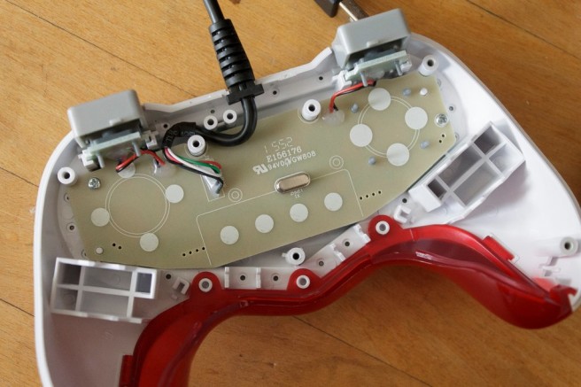 First, it seems that there are two areas where two force feedback motors would have been included, which is further hinted at with “LM” and “RM” prints on the circuit board. This would designate “Left Motor” and “Right Motor” – both would likely be used for rumble support. Also found within the transparent red plastic on the bottom of the controller are “dimples” for LED lights.