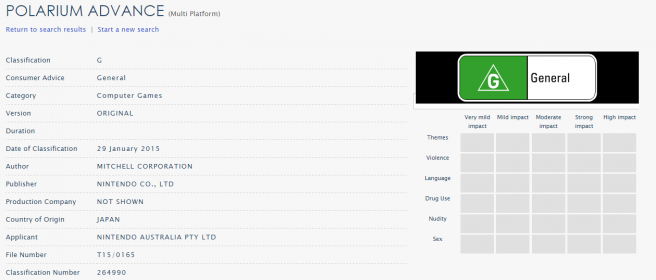 A rating for Polarium Advance appeared in the Australian classification database today. Might it mean that a Virtual Console re-release is on the horizon? Maybe we’ll be seeing Polarium Advance on Wii U soon!