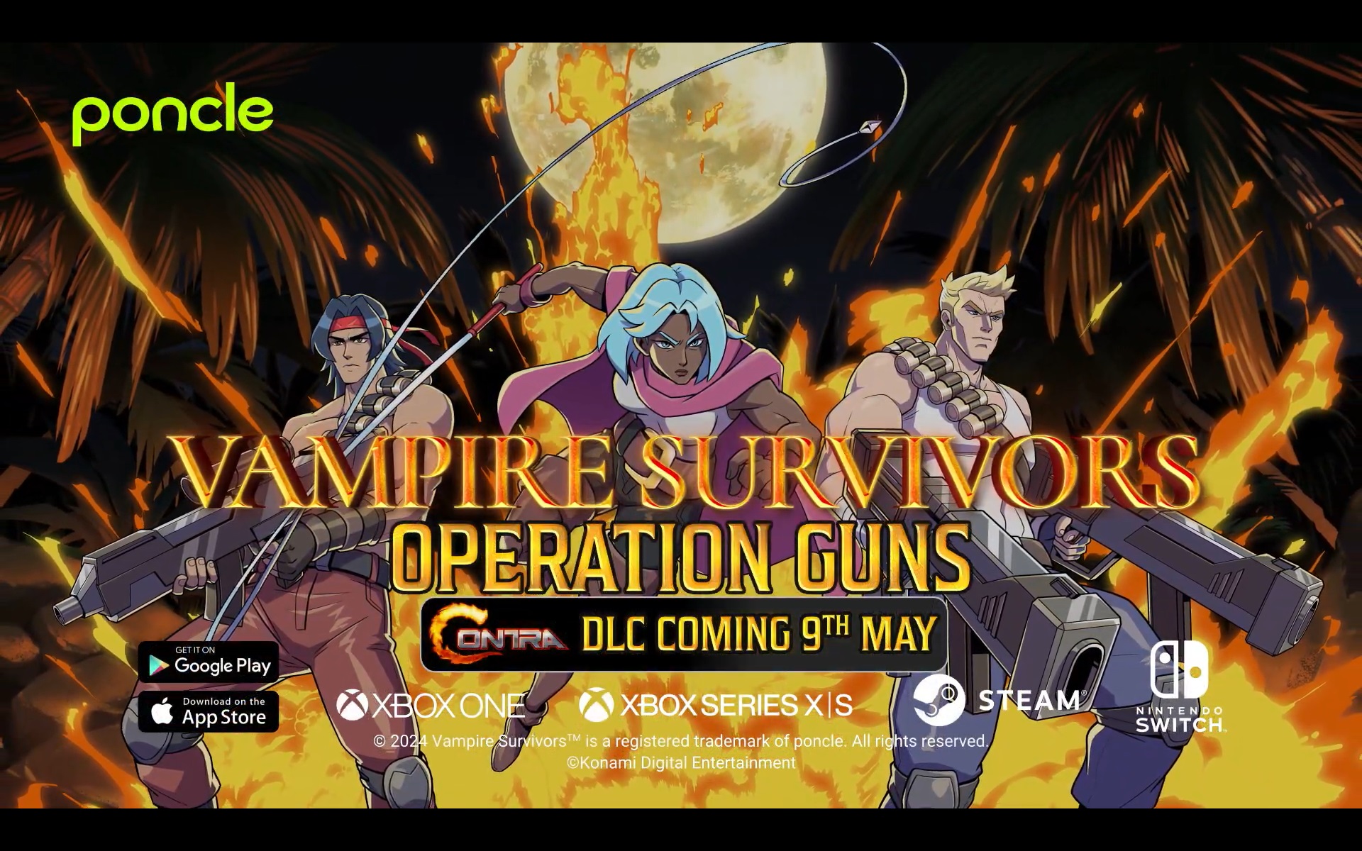 Vampire Survivors today unveiled Operation Guns as its latest DLC, which features a collaboration with Konami’s Contra series. It’s due out on May 9, 2024.