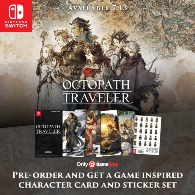 GameStop has revealed a pre-order bonus for Square Enix’s Switch RPG Octopath Traveler. When reserving the game, you’ll receive a game inspired character card and sticker set.