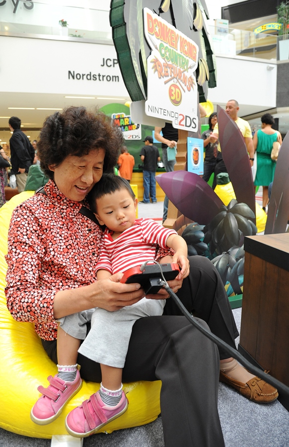 In this photo provided by Nintendo of America and released June 7, 2014, Ronghua W., 64, of China and her granddaughter Sophia X., 2, of Los Angeles, enjoy playing “Donkey Kong Country Returns 3D” at the Westfield Culver City mall on June 6, 2014. The free three-month “Play Nintendo Tour 2014” kicked off in Los Angeles on June 6 and will visit malls and events in a dozen major cities across the United States, showcasing games that feature kid-friendly characters like Donkey Kong, Mario and Kirby, all played on Nintendo 2DS, the latest member of Nintendo’s hand-held family. (Photo by Nintendo/Bob Riha, Jr.)