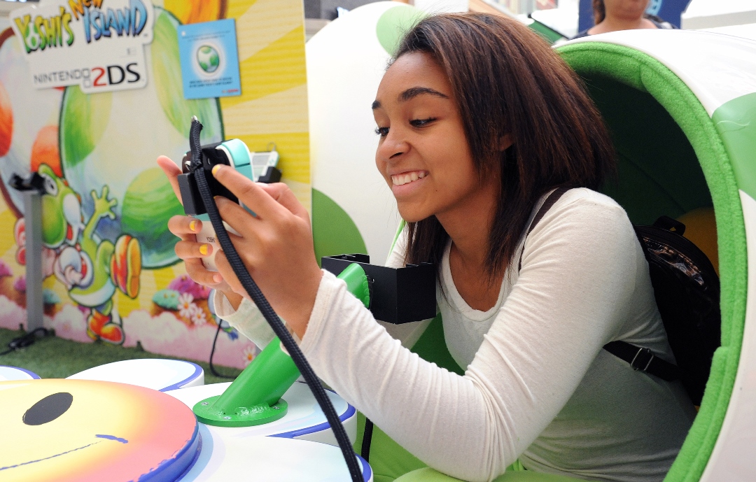 In this photo provided by Nintendo of America and released June 7, 2014, Teoko P.,17, of Los Angeles plays “Yoshi’s New Island” in a Yoshi egg-shaped seat at the Westfield Culver City mall on June 6, 2014, as part of the “Play Nintendo Tour 2014,” which kicked off in Los Angeles on June 6. The free three-month tour will visit malls and events in a dozen major cities across the United States. Nintendo 2DS is an ideal first-time system. (Photo by Nintendo/Bob Riha, Jr.)