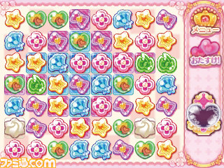 Princess PreCure: Sugar Kingdom and the Six Princesses, a puzzle title, is based on the TV anime Go! Princess PreCure. Gummys are spread across the puzzle board, and players can only move one at a time to line them up. It’s possible to erase three of the same gummys in a row. By clearing stages, you’ll earn stickers.