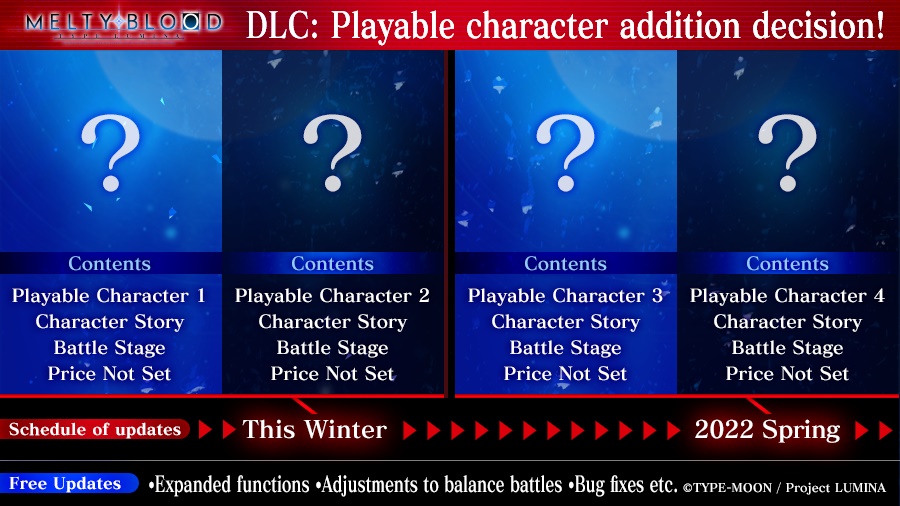 Here’s an overview regarding what’s planned for DLC in Melty Blood: Type Lumina: