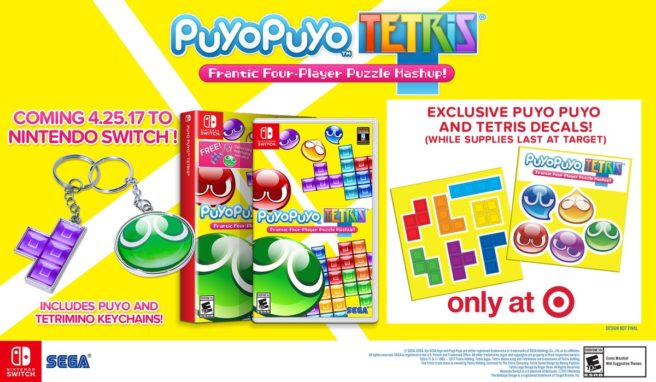 Puyo Puyo Tetris’ launch edition comes with keychains. But if you pick up the game at Target, you’ll receive an extra bonus. The retailer will be handing out Tetris decals while supplies last. A look at the decals can be found above.