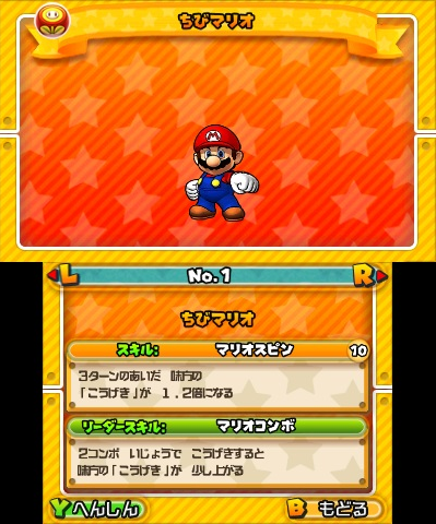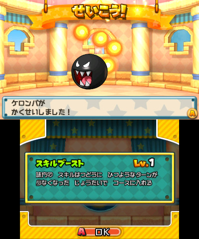 Let’s talk about those random pieces of information first. Famitsu first mentions that a skill can be used after a certain number of turns have passed. This number can be reduced by leveling up the skill in a Toad House. When a skill is activated, a cut-in is shown.