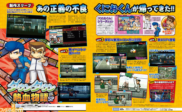 This week’s issue of Famitsu is announcing River City Ransom SP, a new title for 3DS. It’s planned as part of Kunio-kun’s 30th anniversary. Aside from new events, actions, areas, combos and systems, more content will be included compared to the original game.