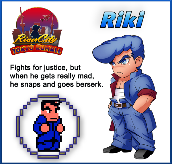 RIKI – A misunderstanding with Kunio roped Riki into the fray. Riki fights for justice, but when he gets really mad, he snaps and goes berserk.