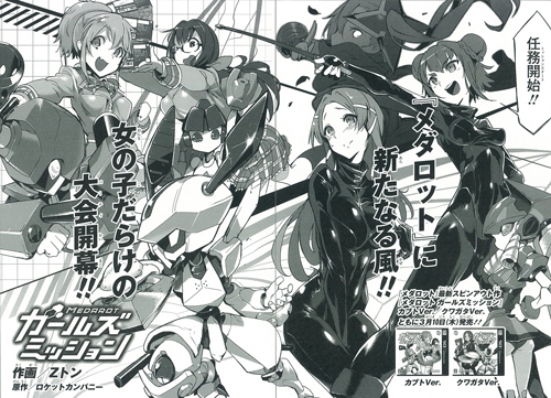A Medabots Girls Mission one-shot manga is also in the works. This is being drawn by Z-Ton and will be published twice in Dengeki Maoh. The April issue (out February 27) will feature Megumi Kaidou and Rokusho from the Kuwagata Ver., and the May issue (out March 26) will focus on Minori Houjou and Metabee from Kabuto Ver.