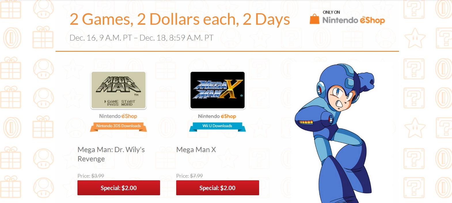 Nintendo and Capcom have kicked off a “2 Games, 2 Dollars each, 2 Days” sale on a pair of Mega Man titles. Mega Man X (Wii U VC) and Mega Man: Dr. Wily’s Revenge (3DS VC) can both be purchased for just $2. The sale lasts until December 18 at 8:59 AM PT.