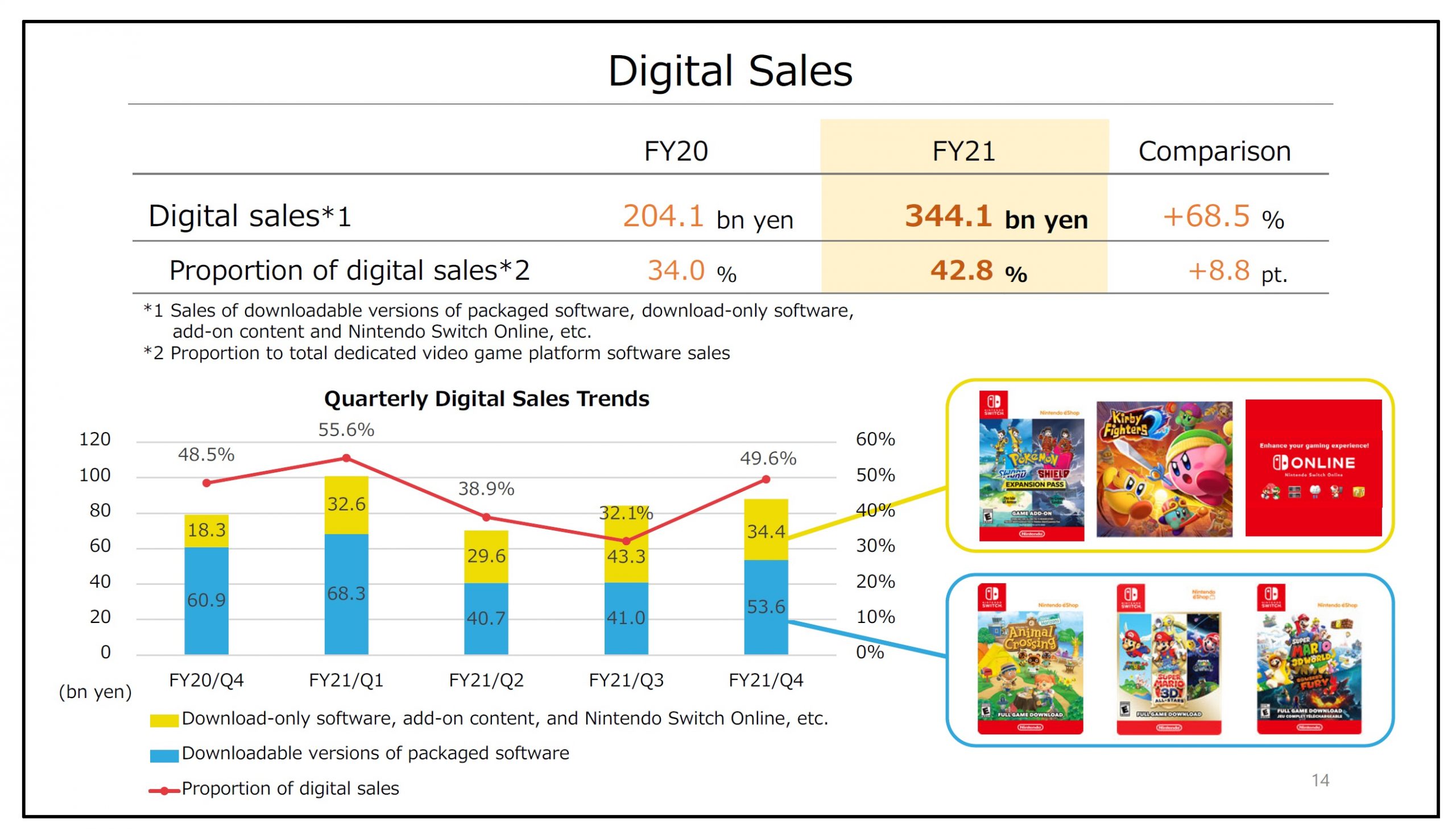 The Pokemon Sword and Pokemon Shield Expansion Pass as well as Super Smash Bros. Ultimate played a big role in sales for add-on content. Nintendo mentioned that there was growth for indie titles, download-only software, and Nintendo Switch Online.