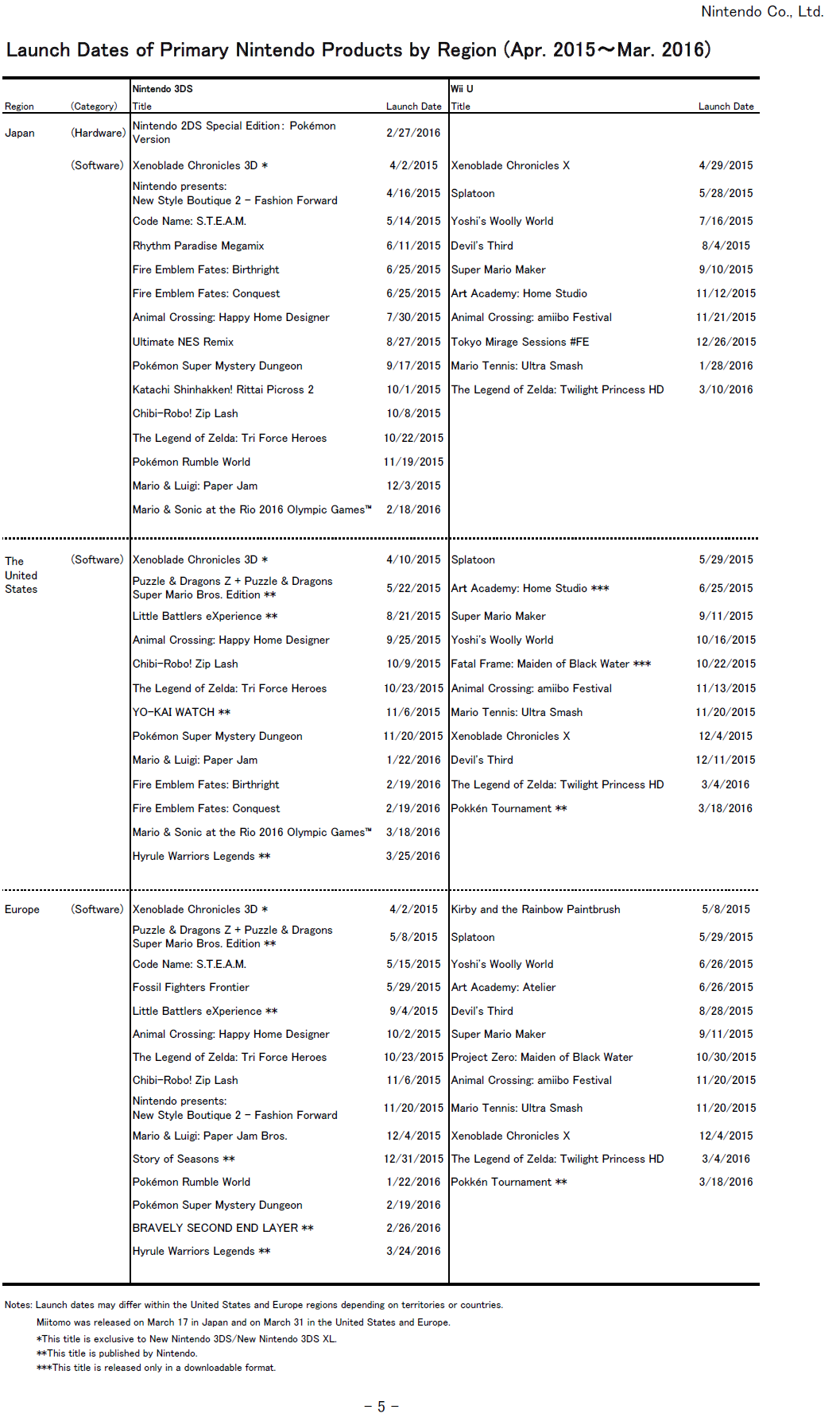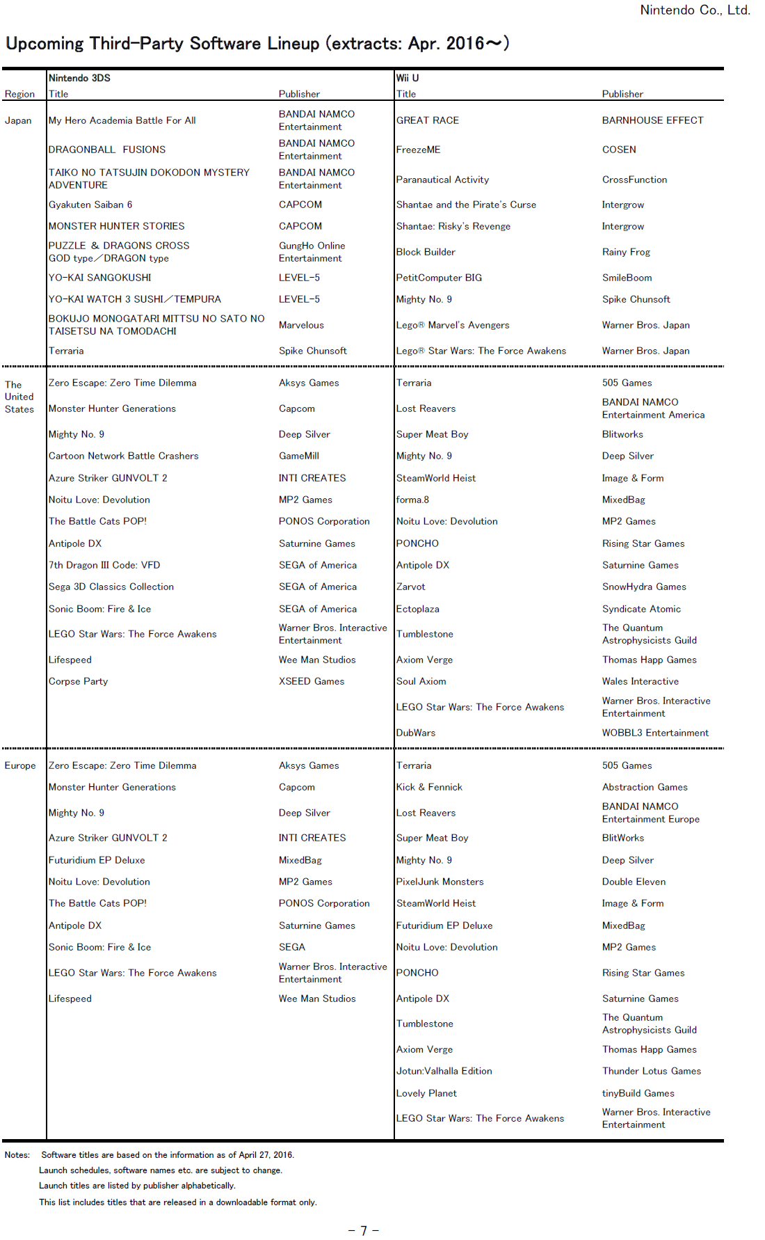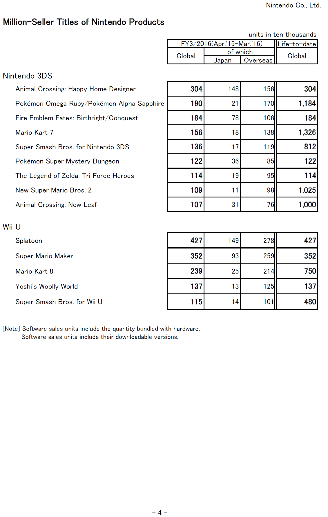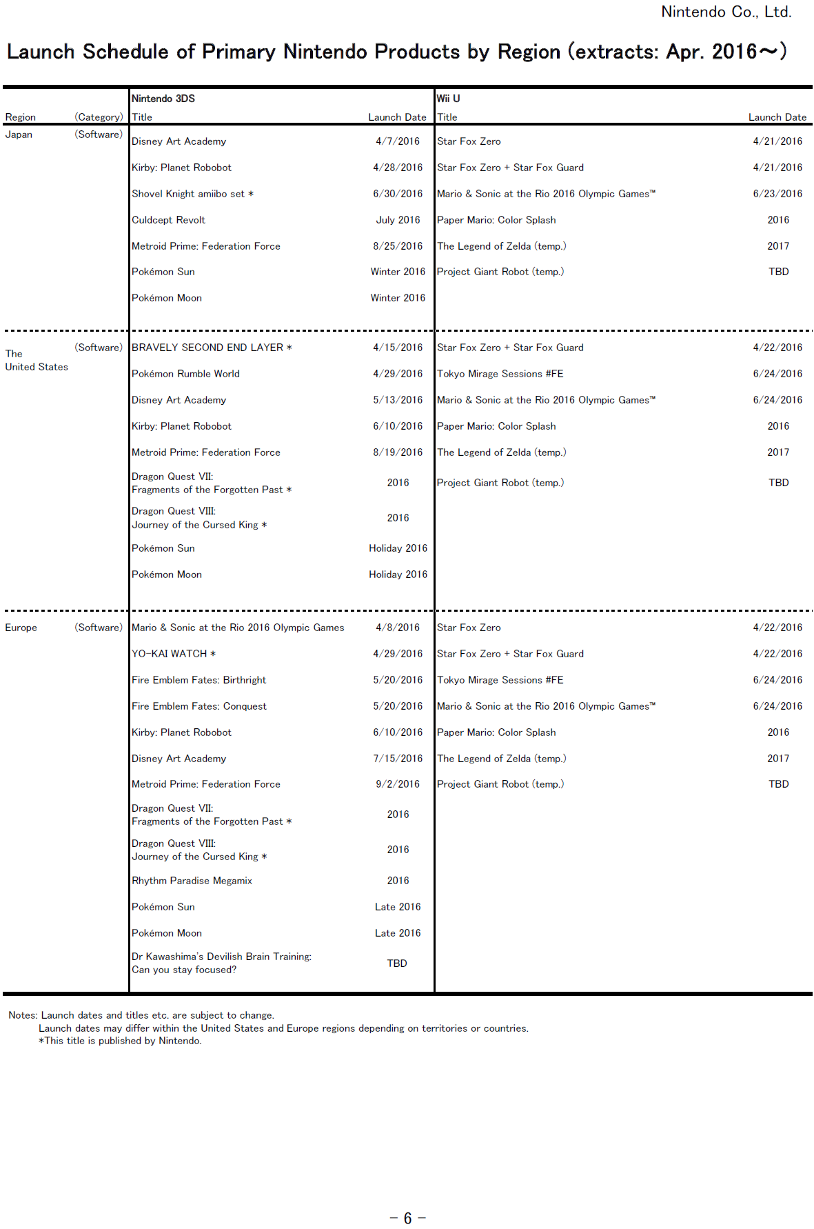 Nintendo release schedule, million sellers – April 2016
