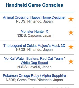 Two Japan-only games made the list: Monster Hunter Generations (coming out this summer in the west) and Yo-kai Watch Busters. The entire lineup isn’t too much of a surprise!