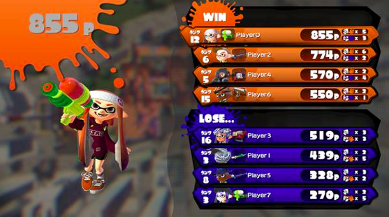 In Turf Battles, the amount of area covered by ink becomes your points. The number of times you knocked out enemies and the number of times you were knocked out is counted to, but these don’t contribute to your score. This means that the ones who spread the most ink are the best.