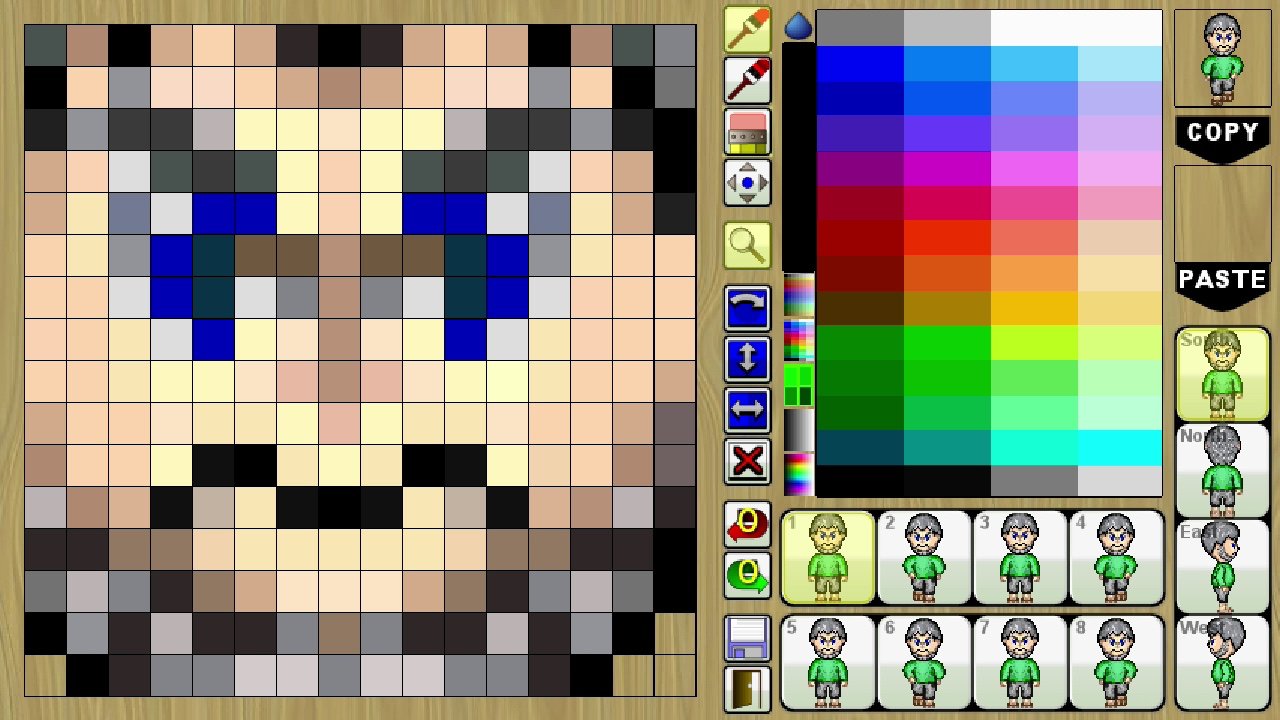 Sprites are comprised of 64×64 pixel art characters that have eight frames of animation for each compass direction. The resulting sprite sheet is a PNG image.