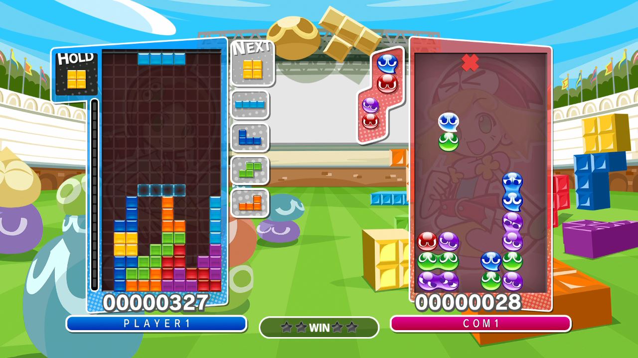 Puyo Puyo Tetris includes a neat little Versus mode. The rules are quite simple: one player takes on a game of Tetris while the other is put in charge of Puyo Puyo. When playing Puyo Puyo, traditional Puyo Puyo Tsu are used, so erasing puyos drops nuisance puyos on the other player’s board. Tetris, on the other hand, makes use of classic Tetris rules.