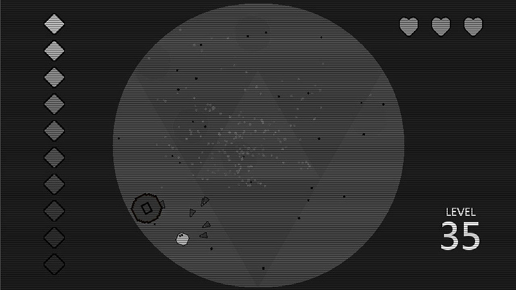 For example, one level might pit your gray blob against two highly-explosive circles and an almighty square, who can only be defeated by slashing the weak point on his back. You could take care the two circles separately and then maneuver around to the square’s backside–but with only a few seconds to clear the level, wouldn’t it be smarter (and faster!) to bat one of the circles into the square to destroy him in the ensuing explosion?